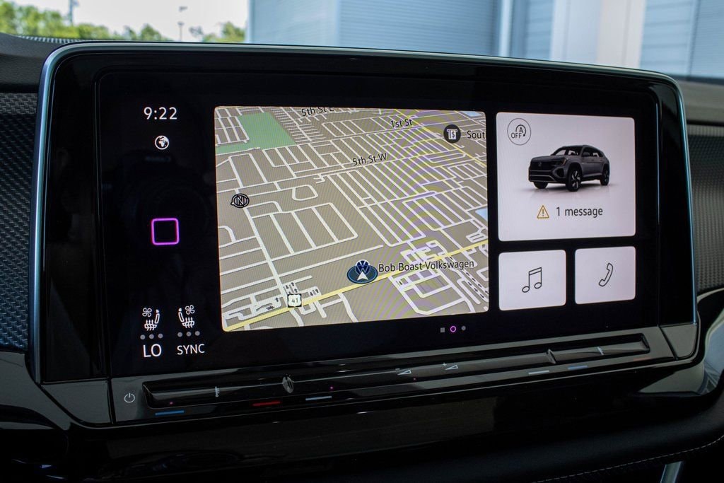 Well equipped with 4-Wheel Disc Brakes, 4-Wheel Independent Suspension, 6 Speakers, ABS brakes, Air Conditioning, Alloy wheels, AM/FM radio: SiriusXM with 360L, Auto High-beam Headlights, Auto-Dimming Rear-View Mirror, Auto-dimming Rear-View mirror, Automatic temperature control, Brake assist, Bumpers: body-color, Compass, Delay-off headlights, Driver door bin, Driver vanity mirror, Dual front impact airbags, Dual front side impact airbags, Electronic Stability Control, Emergency communication system: VW Car-Net Safe & Secure 5-year, Exterior Parking Camera Rear, Four wheel independent suspension, Front anti-roll bar, Front Bucket Seats, Front Center Armrest, Front dual zone A/C, Front fog lights, Front reading lights, Fully automatic headlights, Heads-Up Display, Heated & Actively Ventilated Front Seats, Heated door mirrors, Heated front seats, Heated rear seats, Heated steering wheel, Heavy Duty Trunk Liner w/VW CarGo Blocks, Illuminated entry, Low tire pressure warning, Memory seat, Monster Mats Rubber Mats (Set of 4), Navigation System, Occupant sensing airbag, Outside temperature display, Overhead airbag, Overhead console, Panic alarm, Passenger door bin, Passenger vanity mirror, Perforated Vienna Leather Seating Surfaces, Power door mirrors, Power driver seat, Power Liftgate, Power moonroof: Panoramic, Power passenger seat, Power steering, Power windows, Privacy Cover, Radio data system, Radio: MIB3 Discover Pro Navigation AM/FM/HD, Rain sensing wipers, Rear anti-roll bar, Rear reading lights, Rear seat center armrest, Rear window defroster, Rear window wiper, Remote keyless entry, Rubber Mats Kit, Security system, Speed control, Speed-sensing steering, Split folding rear seat, Spoiler, Steering wheel mounted audio controls, Tachometer, Telescoping steering wheel, Tilt steering wheel, Traction control, Trip computer, Turn signal indicator mirrors, Variably intermittent wipers, Ventilated front seats, VW Care, and Wheels: 20" Black Painted Alloy.