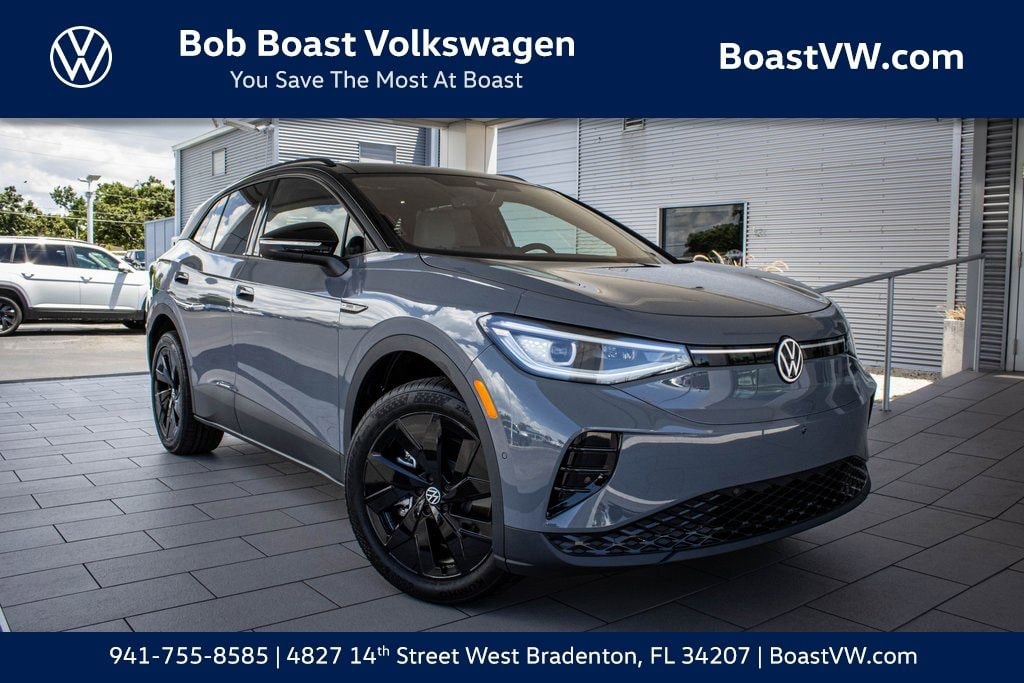 Well equipped with ID.4 Black Package (Black Door Handles, Black Fender Badging, Black Roof Rails, Black Side Mirror Caps, and Wheels: 20" Gloss Black-Painted Alloy), 2-in-1 (240V/120V) EV Charging Cable, 4-Wheel Independent Suspension, 9 Speakers, ABS brakes, Air Conditioning, Alloy wheels, Auto High-beam Headlights, Auto-dimming Rear-View mirror, Auto-Dimming Rearview Mirror with HomeLink Connect, Automatic temperature control, Brake assist, Bumpers: body-color, Delay-off headlights, Driver door bin, Driver vanity mirror, Driver's Seat Mounted Armrest, Dual front impact airbags, Dual front side impact airbags, Electronic Stability Control, Emergency communication system: VW Car-Net Safe & Secure 5-year, EV Roadside Assistance Kit, Exterior Parking Camera Rear, First Aid Kit, Four wheel independent suspension, Front anti-roll bar, Front Bucket Seats, Front dual zone A/C, Front fog lights, Front reading lights, Fully automatic headlights, harman/kardon® Speakers, Heated and Actively Ventilated Front Seats, Heated door mirrors, Heated front seats, Heated rear seats, Heated steering wheel, Heavy Duty Trunk Liner with VW CarGo Blocks, Illuminated entry, Low tire pressure warning, Navigation System, Occupant sensing airbag, Outside temperature display, Overhead airbag, Overhead console, Panic alarm, Passenger door bin, Passenger seat mounted armrest, Passenger vanity mirror, Perforated V-Tex Leatherette Seating Surfaces, Power door mirrors, Power driver seat, Power Liftgate, Power passenger seat, Power steering, Power windows, Radio data system, Radio: Discover Pro Max with Touchscreen Navigation, Rain sensing wipers, Rear air conditioning, Rear anti-roll bar, Rear reading lights, Rear seat center armrest, Rear window defroster, Rear window wiper, Remote keyless entry, Rubber Monster Mats Kit (set of 4), Speed control, Speed-sensing steering, Split folding rear seat, Spoiler, Steering wheel mounted audio controls, Telescoping steering wheel, Tilt steering wheel, Traction control, Trip computer, Turn signal indicator mirrors, Variably intermittent wipers, Ventilated front seats, VW Care, and Wheels: 21" 2-Tone Machined Alloy.