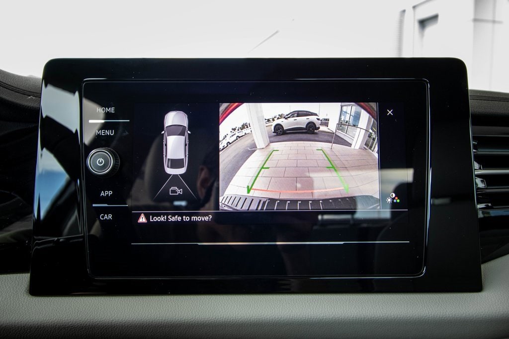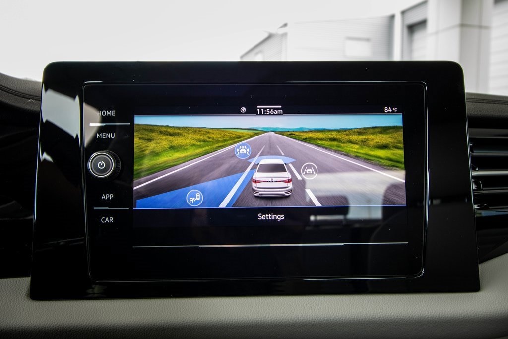 Well equipped with Gray Cloth, 4 Speakers, 4-Wheel Disc Brakes, ABS brakes, Active Blind Spot Monitor, Air Conditioning, Alloy wheels, Auto-dimming Rear-View mirror, Automatic temperature control, Brake assist, Bumpers: body-color, Cloth Seat Trim, Delay-off headlights, Driver door bin, Driver vanity mirror, Dual front impact airbags, Dual front side impact airbags, Electronic Stability Control, Emergency communication system: VW Car-Net Safe & Secure 5-year, Exterior Parking Camera Rear, Front anti-roll bar, Front Bucket Seats, Front Center Armrest, Front dual zone A/C, Front Seats, Front wheel independent suspension, Fully automatic headlights, Heated door mirrors, Illuminated entry, Leather Shift Knob, Leather steering wheel, Low tire pressure warning, Occupant sensing airbag, Outside temperature display, Overhead airbag, Overhead console, Panic alarm, Passenger door bin, Passenger vanity mirror, Power door mirrors, Power steering, Power windows, Radio data system, Radio: MIB3 Composition Color w/8" Touchscreen, Rain sensing wipers, Rear anti-roll bar, Rear reading lights, Rear window defroster, Remote keyless entry, Speed control, Speed-sensing steering, Split folding rear seat, Steering wheel mounted audio controls, Tachometer, Telescoping steering wheel, Tilt steering wheel, Traction control, Trip computer, Variably intermittent wipers, VW Care, and Wheels: 16" 2-Tone Machined Alloy.