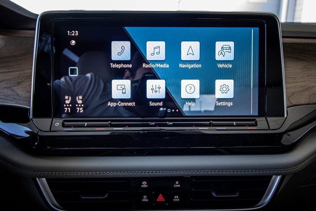 Well equipped with Black Wheel Package (Wheels: 20" Multi-Spoke Black Painted Alloy), 3rd row seats: split-bench, 4-Wheel Disc Brakes, 4-Wheel Independent Suspension, 6 Speakers, ABS brakes, Air Conditioning, Alloy wheels, AM/FM radio: SiriusXM with 360L, Auto High-beam Headlights, Auto-dimming Rear-View mirror, Automatic temperature control, Brake assist, Bumpers: body-color, Compass, Delay-off headlights, Driver door bin, Driver vanity mirror, Dual front impact airbags, Dual front side impact airbags, Electronic Stability Control, Emergency communication system: VW Car-Net Safe & Secure 5-year, Exterior Parking Camera Rear, First Aid Kit, Four wheel independent suspension, Front anti-roll bar, Front Bucket Seats, Front Center Armrest, Front dual zone A/C, Front fog lights, Front reading lights, Fully automatic headlights, Garage door transmitter: HomeLink, Heated & Actively Ventilated Front Bucket Seats, Heated door mirrors, Heated front seats, Heated steering wheel, Heavy Duty Trunk Liner w/VW CarGo Blocks, Illuminated entry, Low tire pressure warning, Occupant sensing airbag, Outside temperature display, Overhead airbag, Overhead console, Panic alarm, Passenger door bin, Passenger vanity mirror, Perforated V-Tex Leatherette Seating Surfaces, Power door mirrors, Power driver seat, Power Liftgate, Power steering, Power windows, Radio data system, Radio: MIB3 Composition Media, Rain sensing wipers, Rear air conditioning, Rear anti-roll bar, Rear reading lights, Rear seat center armrest, Rear window defroster, Rear window wiper, Remote keyless entry, Retractable Privacy Cover For Cargo Area, Roadside Assistance Kit, Rubber Mats Kit (2-Row), Security system, Speed control, Speed-sensing steering, Split folding rear seat, Spoiler, Steering wheel mounted audio controls, Tachometer, Telescoping steering wheel, Tilt steering wheel, Traction control, Trip computer, Turn signal indicator mirrors, Variably intermittent wipers, Ventilated front seats, VW Care, and Wheels: 20" 2-Tone Machined Alloy.