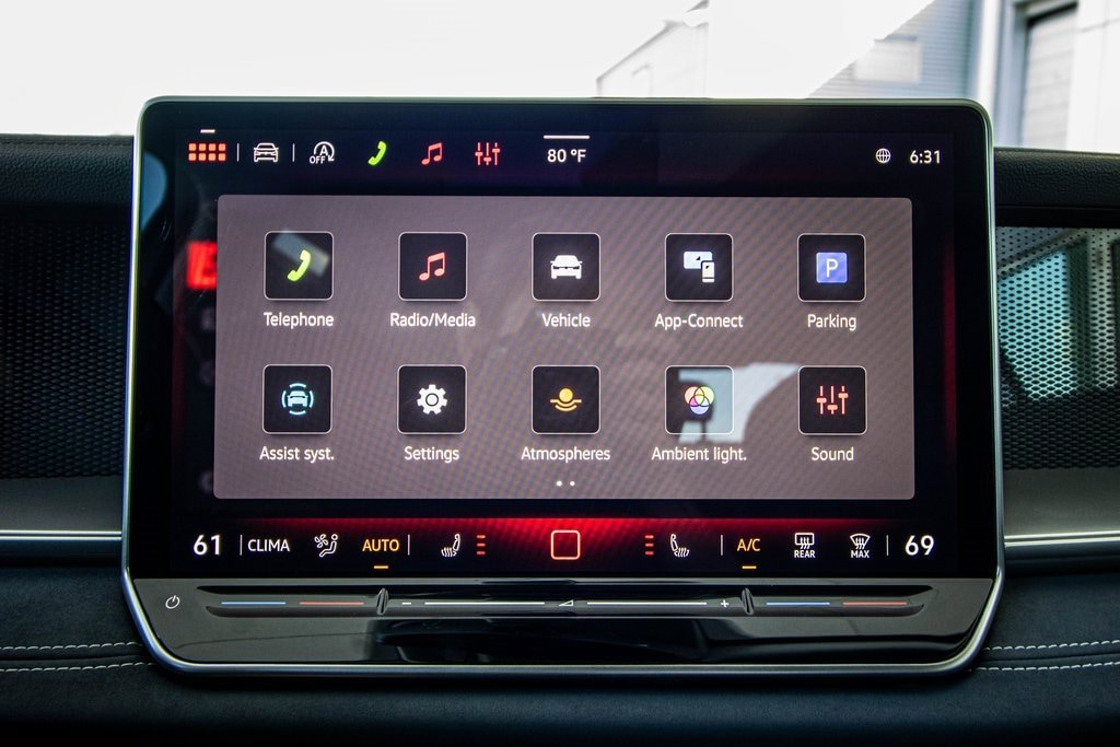 Well equipped with 4-Wheel Disc Brakes, 4-Wheel Independent Suspension, 7 Speakers, ABS brakes, Air Conditioning, Alloy wheels, AM/FM radio: SiriusXM with 360L, Auto High-beam Headlights, Auto-dimming Rear-View mirror, Auto-Dimming Rearview Mirror with HomeLink, Automatic temperature control, Brake assist, Bumpers: body-color, Compass, Delay-off headlights, Driver door bin, Driver vanity mirror, Dual front impact airbags, Dual front side impact airbags, Electronic Stability Control, Emergency communication system, Exterior Parking Camera Rear, First Aid Kit, Four wheel independent suspension, Front anti-roll bar, Front Bucket Seats, Front Center Armrest, Front dual zone A/C, Front reading lights, Fully automatic headlights, Heated door mirrors, Heated Front Seats, Heated front seats, Heavy Duty Trunk Liner with VW CarGo Blocks, Illuminated entry, Knee airbag, Leather Shift Knob, Low tire pressure warning, Occupant sensing airbag, Outside temperature display, Overhead airbag, Overhead console, Panic alarm, Passenger door bin, Passenger vanity mirror, Perforated V-Tex Leatherette Seating Surfaces, Power door mirrors, Power driver seat, Power Liftgate, Power steering, Power windows, Radio data system, Radio: MIB4 Composition Media Touchscreen with AM/FM, Rain sensing wipers, Rear anti-roll bar, Rear reading lights, Rear seat center armrest, Rear side impact airbag, Rear window defroster, Rear window wiper, Remote keyless entry, Roadside Assistance Kit, Rubber Monster Mats Kit (set of 4), Security system, Speed control, Speed-sensing steering, Split folding rear seat, Spoiler, Steering wheel mounted audio controls, Tachometer, Telescoping steering wheel, Tilt steering wheel, Traction control, Trip computer, Turn signal indicator mirrors, Variably intermittent wipers, VW Care, and Wheels: 19" 2-Tone Machined Alloy.